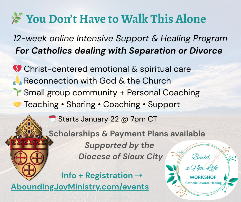Led by certified Catholic Divorce Healing Coach Carolyn Klika Catino, this 12-week journey provides tools for emotional healing, spiritual renewal, and practical rebuilding—grounded in the truth and love of the Church. The next workshop begins on January 22!