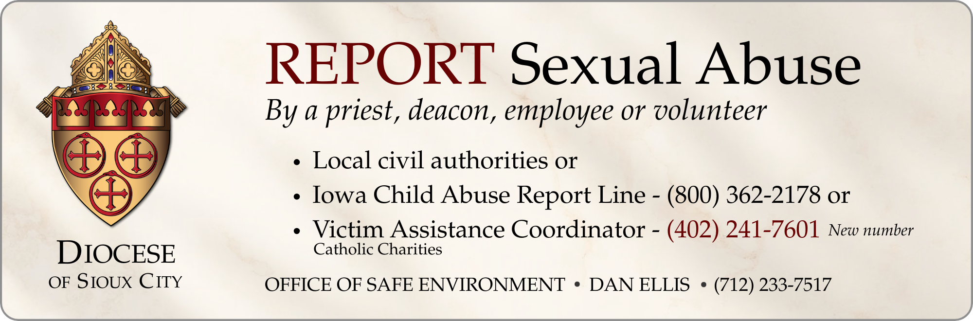 Equally important, this policy provides a framework for reporting and responding to allegations of sexual abuse of a minor by a member of the clergy, an employee or a volunteer of the Diocese.